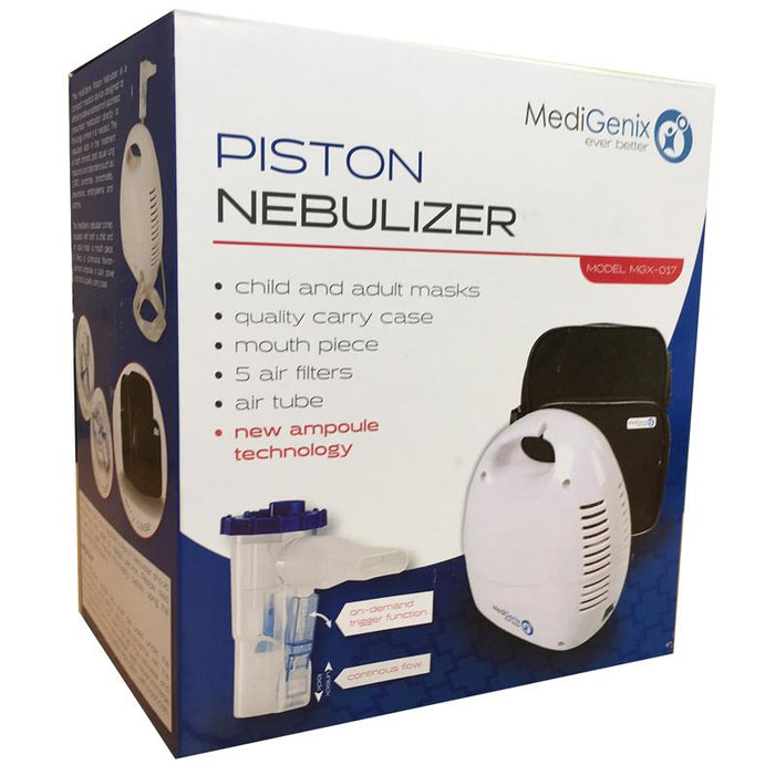 The MediGenix Piston Nebulizer with the latest ON-DEMAND ampoule comes with a quality carry bag that has 2 compartments, an adult mask, a child mask, a mouthpiece, air tube and 5 filters and works off electric mains.